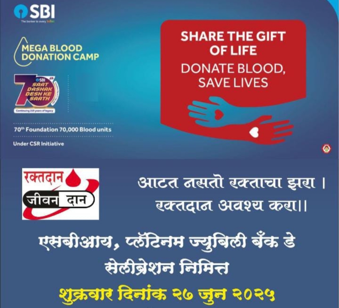 उद्या भारतीय स्टेट बँक शाखा वाशीम मध्ये भव्य रक्तदान शिबिराचे आयोजन