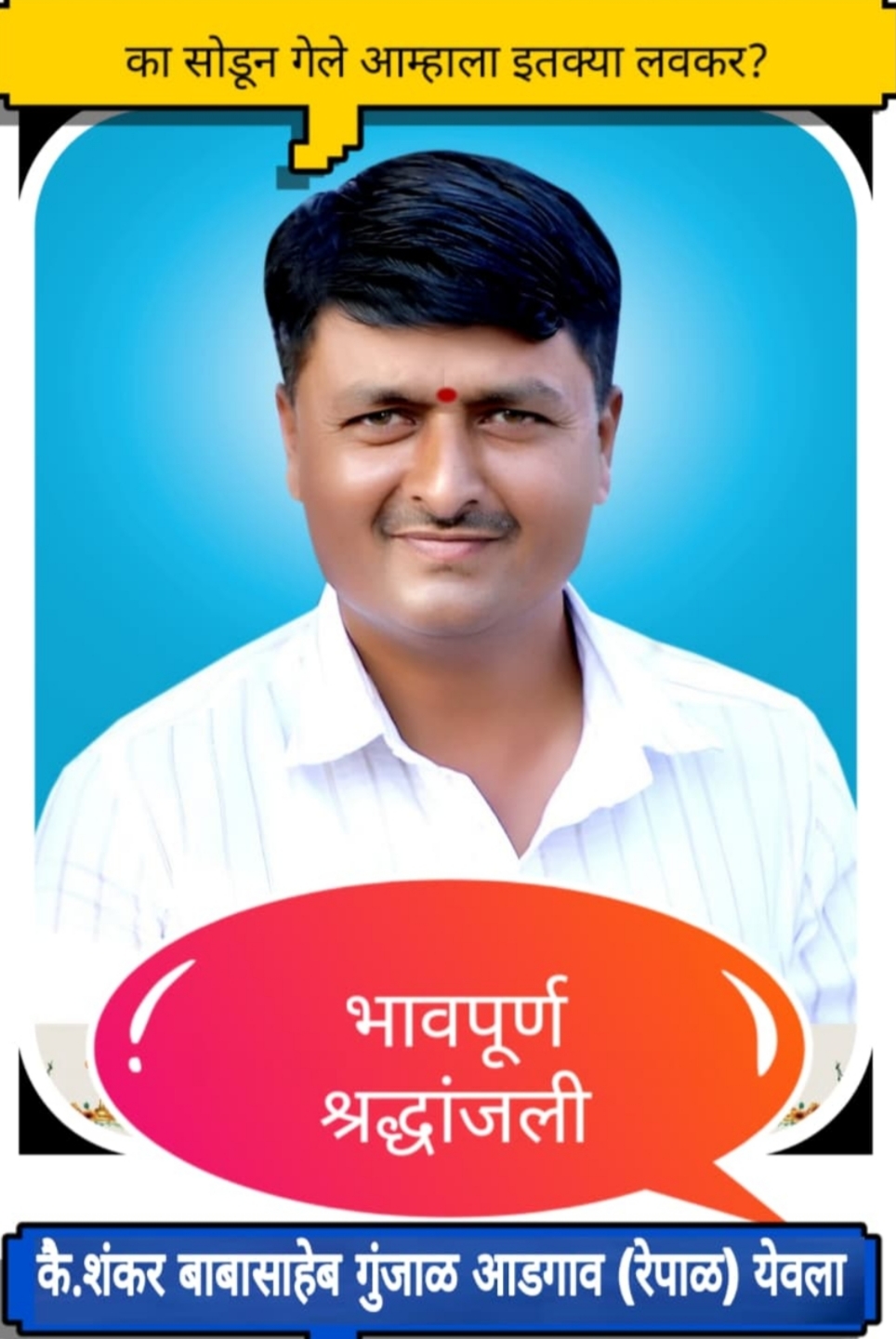 ‘ना भरोसा इस जिंदगी का’ या उक्तीप्रमाणे आमचे स्नेही सन्मित्र तसेच नातलग ,आडगाव रेपाळ तालुका येवला येथील प्रगतीशील शेतकरी, समृध्दी फिडस् पुणे संचालक मच्छिंद्र बाबासाहेब गुंजाळ यांचे मोठे बंधू व इंजिनिअर निलेश देवरे निमोण तालुका चांदवड यांचे दाजी शंकर बाबासाहेब गुंजाळ वय: ४२ वर्षे यांचे हृदयविकाराच्या झटक्याने दुःखद निधन झाले.