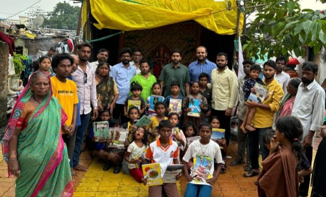 शहरातील साठे नगर व परिसरातील गोरगरीबांच्या या वस्तीत वह्या व पेन या