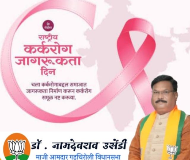 आज, ७ नोव्हेंबर रोजी देशभरात राष्ट्रीय कर्करोग जागरूकता दिन साजरा करण्यात येत आहे. या दिनानिमित्त डॉ. नामदेवराव उसेंडी (माजी आमदार) यांनी जनतेला आरोग्याबाबत सजग राहण्याचे आवाहन केले आहे.