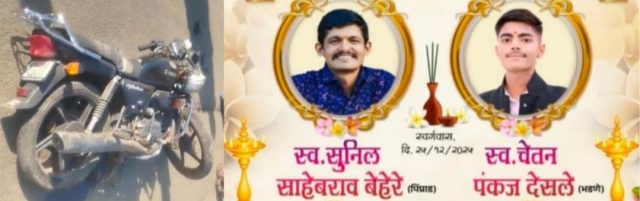 शिंदखेडा तालुक्यातील बाभळे फाट्याजवळ कंटेनरच्या धडकेत मामा-भाचा जागीच ठार झाल्याची घटना आज सकाळी साडेआठ वाजेच्या सुमारास घडली. घटनेची माहिती मिळताच शिंदखेडा पोलिसांनी घटनास्थळी धाव घेतली होती.शिंदखेडा तालुक्यातील पिंप्राळ गावातील रहिवासी सुनिल साहेबराव बेहेरे(विरदेलकर)(३५) व त्यांचा भाचा चेतन पंकज देसले (२१) रा. भडणे हे आज याच्यासोबत दुचाकी (एमएच १८/ बीडब्ल्यु २४२०) ने एमआयडीसीत नेहमीप्रमाणे कामाला जात होते. सकाळी साडेआठ वाजेच्या सुमारास बाभळे फाट्याजवळ मागाहून येणाऱ्या भरधाव कंटेनर (डिएन ०९/आर ९८६७) ने त्यांच्या दुचाकीला जोदार धडक दिली. या भीषण अपघातात मामा-भाचे जागीच ठार झाले. यावेळी रस्त्यावरील प्रवाशांनी तात्काळ पोलीस मदत केंद्रावर माहिती कळविली. त्यानंतर शिंदखेडा पोलिसांनी घटनास्थळी धाव घेतली होती. दोघांना १०८ रुग्णवाहिकेद्वारे नरडाणा प्राथमिक आरोग्य केंद्रात दाखल करण्यात आले. मात्र दोघांची प्राणज्योत मालवली होती.